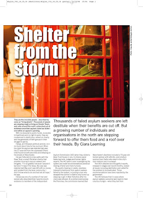 I've written numerous times about those asylum seekers and refugees who fall through the many cracks in the system and end up destitute, trapped in a position of dependence, for many months or years. So it seemed like an opportune time to look at some of the big-hearted groups and individuals from this country who try to help these unfortunates - by putting them up in their own homes, feeding them, helping them to fill out the relevant forms and fight for their rights...The story is published in the current edition of the Big Issue in the North.